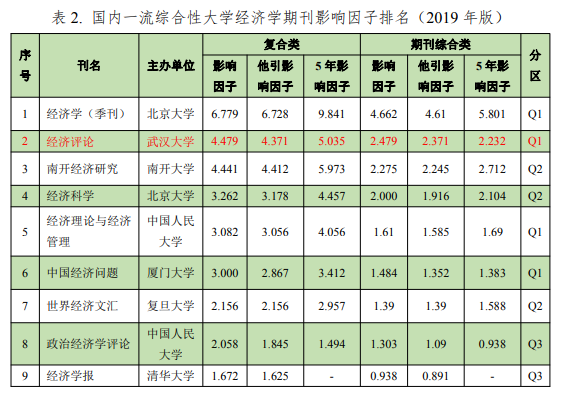 根据2019年公布的统计数据(2018),《经济评论》的复合影响因子和综合影响因子可以在“经济学理论”期刊中排名第4,仅低于《经济研究》《经济学(季刊)》《数量经济技术经济研究》(见表1)。