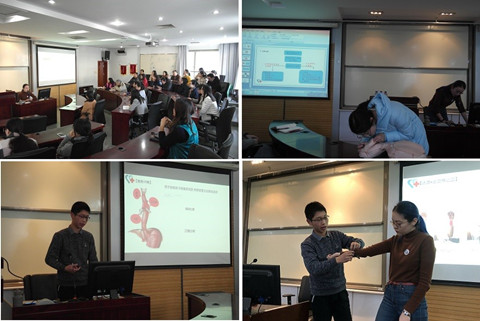 “救护之翼”副会长宋凯讲师向大家详细讲解了心肺复苏术和人工呼吸的基本原则、方法步骤及注意要点,并结合理论知识与助教王祉祎一起进行了示范性操作。“救护之翼”宣传部部长何浩东讲师结合医院案例,详细介绍了鱼刺卡喉、气道异物梗阻、酒精中毒、虫蛇叮咬等常见意外伤害的处理方法及创伤救护止血法,并现场演示了加压包扎、止血带止血等急救操作方法。